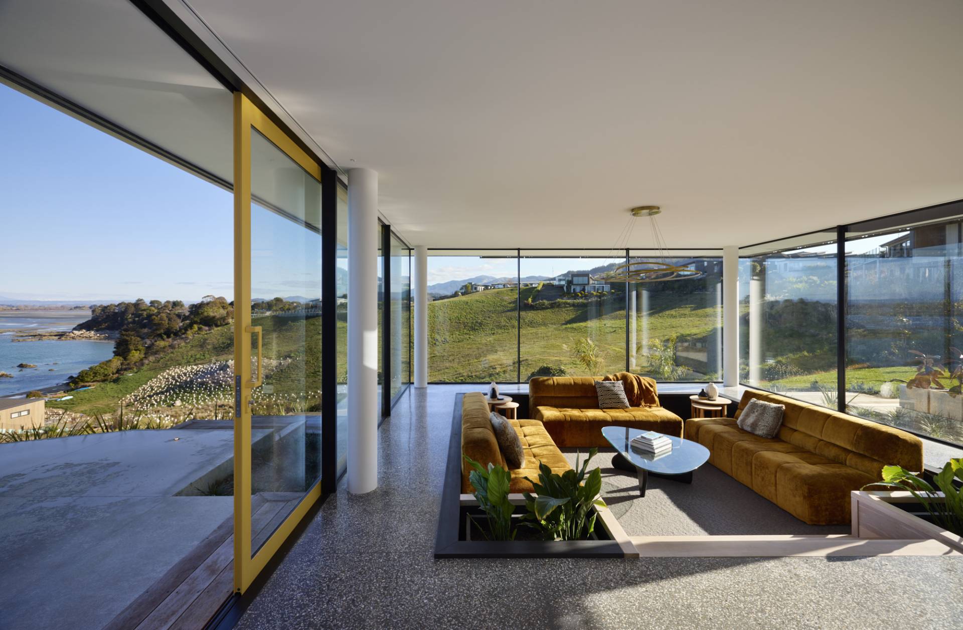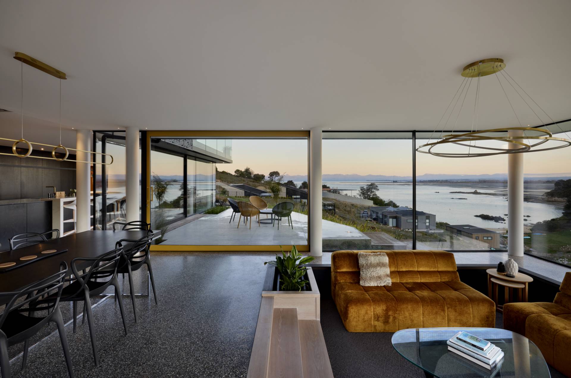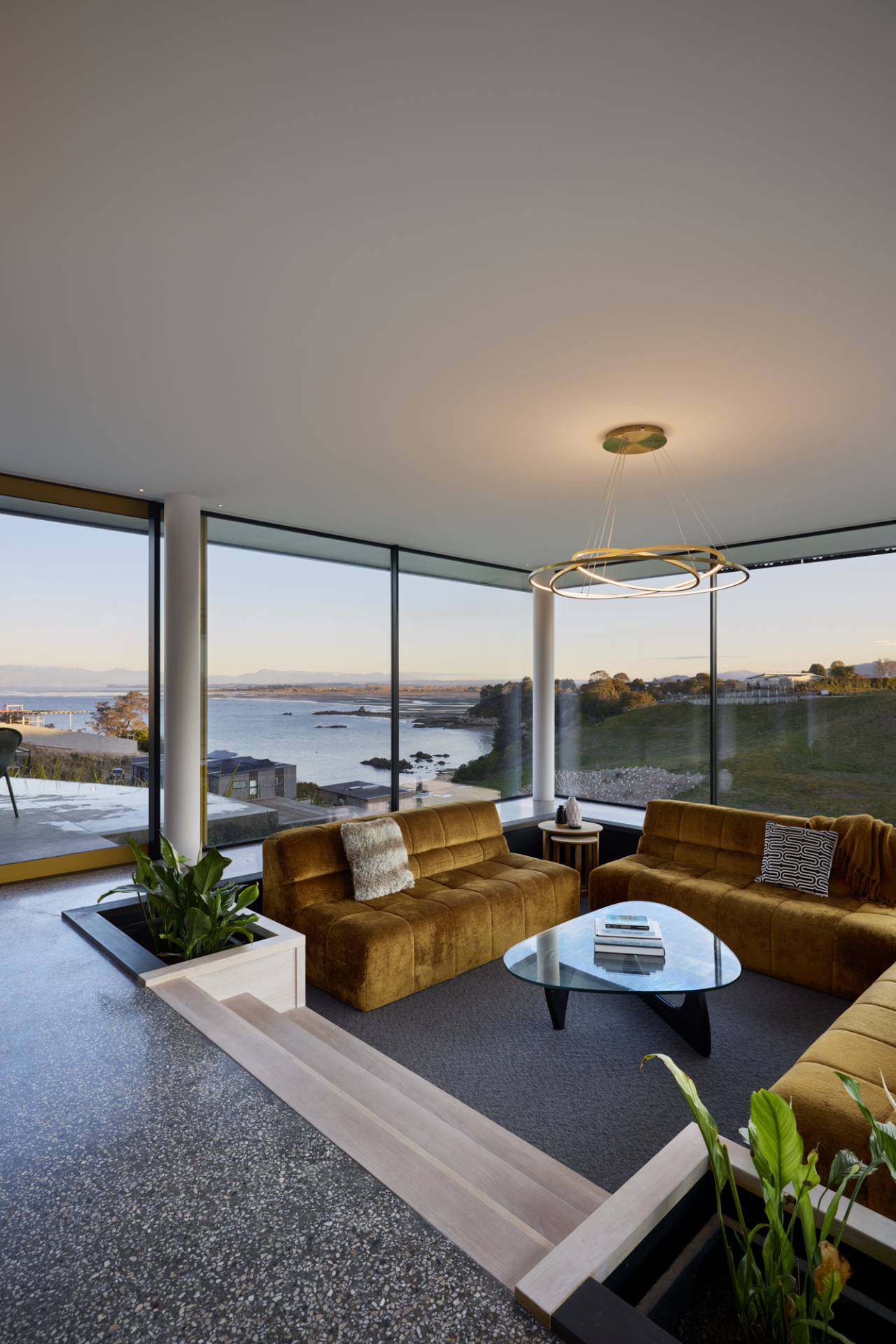 The result? A house where the boundary between indoors and outdoors seems to disappear. The sunken lounge has those gorgeous views uninterrupted by floor-to-ceiling windows, and the large sliders opening from the dining and living areas means Paul and his family can fully connect with the landscape, no matter what the weather’s doing.